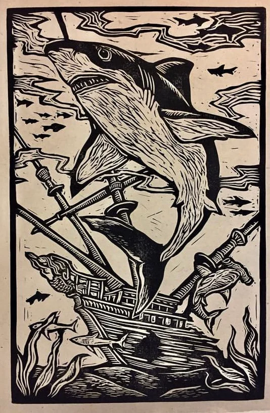Sharks And Shipwreck Block Print