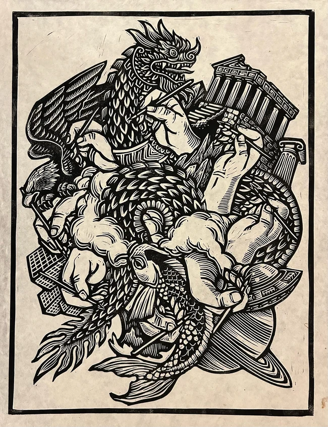 18”x24″ 2-color linocut on 20″x26″ Lokta paper